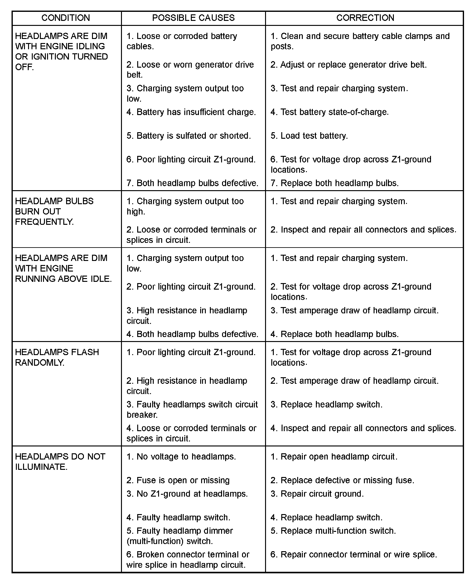When a vehicle experiences problems with the headlamp system, verify the condition of the battery connections, fuses, charging system, headlamp bulbs, wire connectors, relay, high beam switch, dimmer switch, and headlamp switch. The wiring information includes wiring diagrams, proper wire and connector repair procedures, details of wire harness routing and retention, connector pin-out information and location views for the various wire harness connectors, splices and grounds.