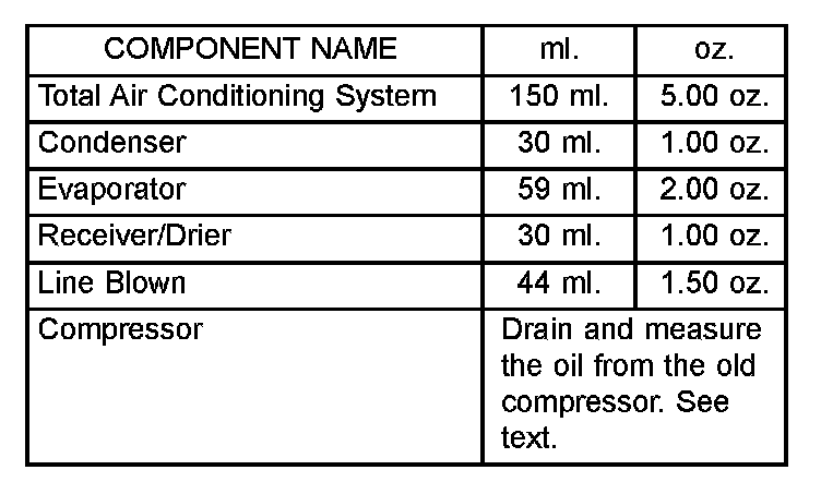 REFRIGERANT OIL LEVEL CHECKWhen an air conditioning system is first assembled, all components (except the compressor) are refrigerant oil free. After the system has been charged with (R-134a) refrigerant and operated, the oil in the compressor is dispersed through the lines and components. The evaporator, condenser, and receiver/drier will retain a significant amount of oil. Refer to the A/C Component Refrigerant Oil Capacities table. When a component is replaced, the specified amount of refrigerant oil must be added. When the compressor is replaced, the amount of oil that is retained in the rest of the system must be drained from the replacement compressor. The oil capacity of the system, minus the amount of oil still in the remaining components (refer to the oil capacity chart below) can be measured and poured into the suction port of the compressor. When a line or component has ruptured and oil has escaped, the receiver/drier must be replaced along with the ruptured part.
