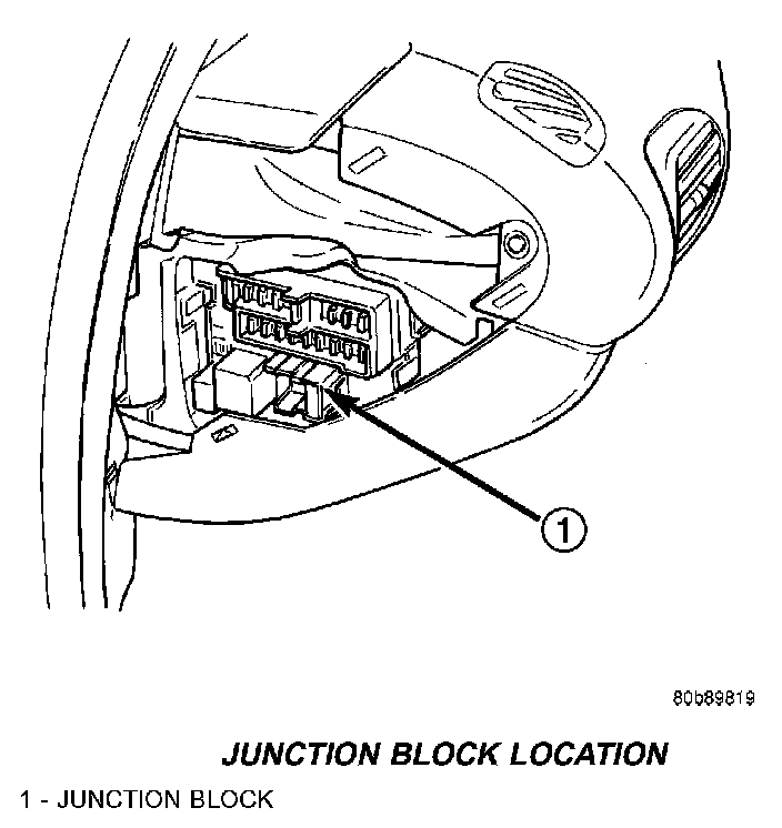 An electrical Junction Block (JB) is located in the left end cap of the instrument panel. The JB combines the functions previously provided by a separate fuse block module and relay center. It also serves to simplify and centralize numerous electrical components, as well as to distribute electrical current to many of the accessory systems in the vehicle. It eliminates the need for numerous splice connections and serves in place of a bulkhead connector between many of the engine compartment, instrument panel, and body wire harnesses.Junction Block Location: