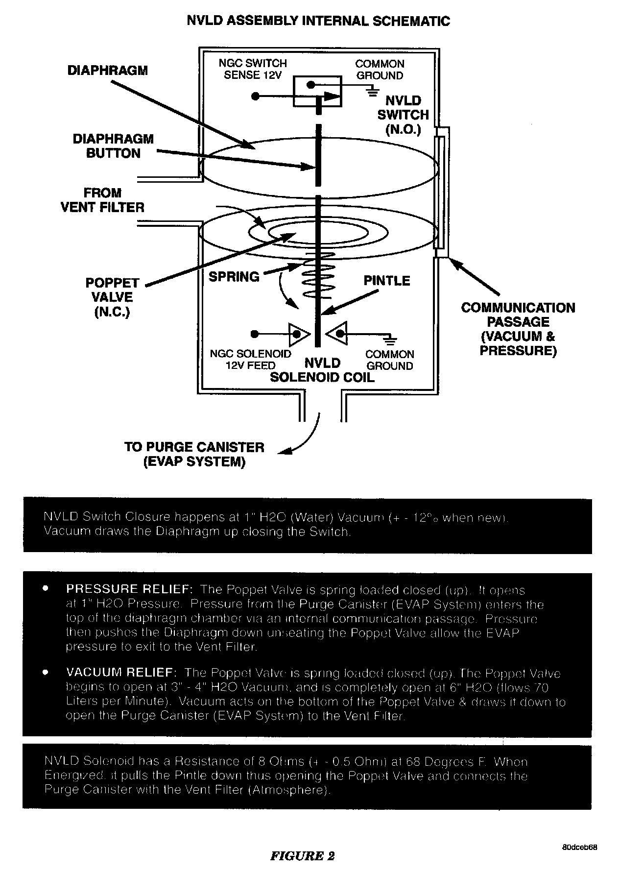 The normally closed valve in the NVLD is intended to maintain the seal on the evaporative system during the engine off condition. If vacuum in the evaporative system exceeds 3 inches to 6 inches H2O (0.75 to 1.5 KPA), the valve will be pulled off the seat opening the seal. This will protect the system from excessive vacuum as well as allowing sufficient purge flow in the event that the solenoid was to become inoperative. The solenoid actuates the valve to unseal the canister vent while the engine is running. It also will be used to close the vent during the medium and large leak tests and during the
