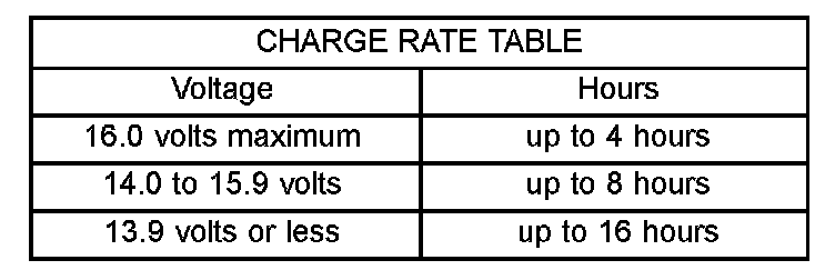 3. Battery chargers vary in the amount of voltage and current they provide. The amount of time required for a battery to accept measurable charging current at various voltages is shown in the Charge Rate Table. If the charging current is still not measurable at the end of the charging time, the battery is faulty and must be replaced. If the charging current is measurable during the charging time, the battery may be good and the charging should be completed in the normal manner.