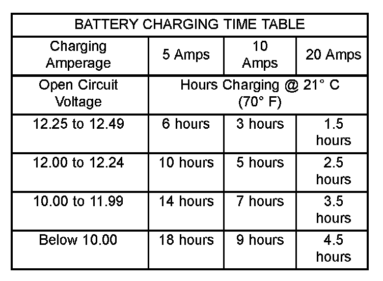 The Battery Charging Time Table gives an indication of the time required to charge a typical battery at room temperature based upon the battery state-of-charge and the charger capacity.