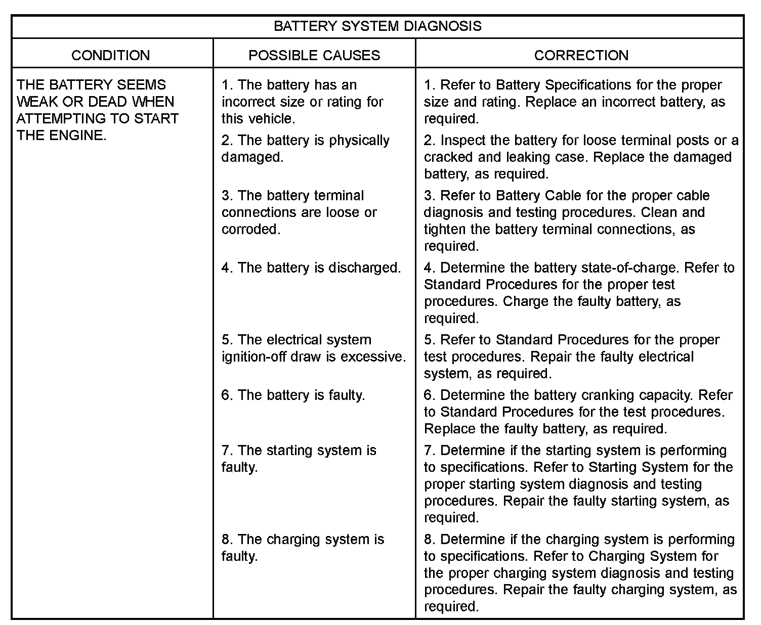 8. A faulty or incorrect battery. Refer to Standard Procedures for the proper battery diagnosis and testing procedures. Refer to Battery System Specifications for the proper specifications.