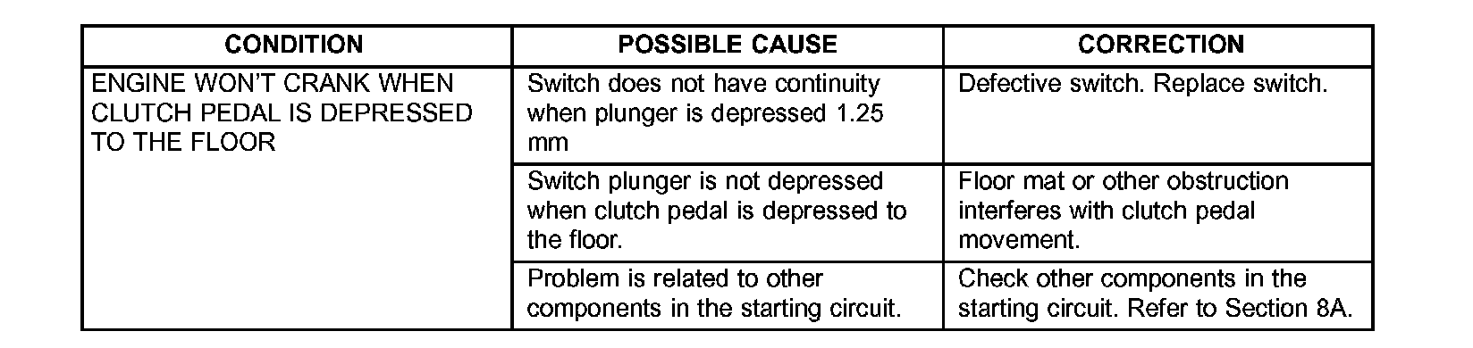 If vehicle will not crank, even with clutch pedal pressed to the floor, refer to "Service Diagnosis Clutch Pedal Position Switch" chart.