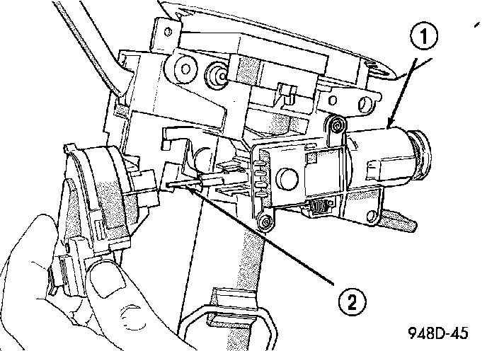The ignition switch (1) attaches to the lock cylinder housing (2) on the end opposite the lock cylinder. For ignition switch terminal and circuit identification, refer to the Wiring Diagrams sections.