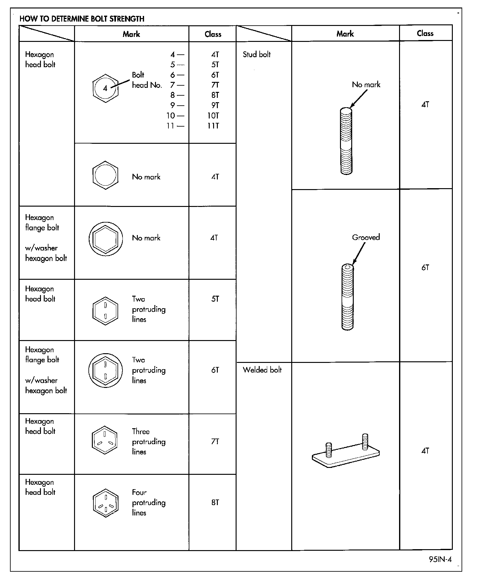 The SAE bolt strength grades range from grade 2 to grade 8. The higher the grade number, the greater the bolt strength. Identification is determined by the line marks on the top of each bolt head. The actual bolt strength grade corresponds to the number of line marks plus 2. The most commonly used metric bolt strength classes are 9.8 and 10.9. The metric strength class identification number is imprinted on the head of the bolt. The higher the class number, the greater the bolt strength. Some metric nuts are imprinted with a single-digit strength class on the nut face. Refer to the Fastener Identification and Fastener Strength Charts.