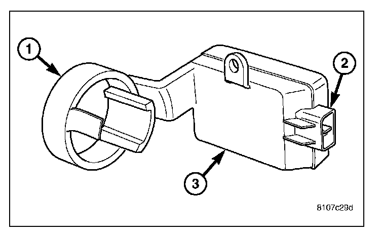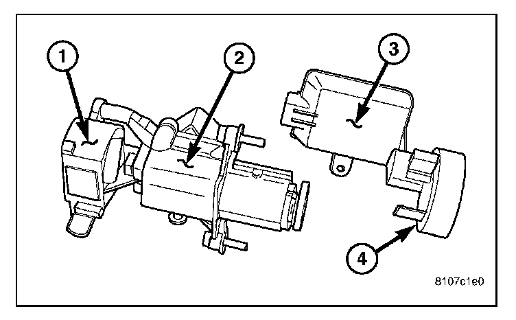 The SKREEM is located on and around (antenna ring) (4) the ignition key cylinder (2) along with the ignition switch (1). It is accessible only from behind the instrument panel, to the left of the steering column. Serviceability requires lock cylinder removal to access the complete unit.