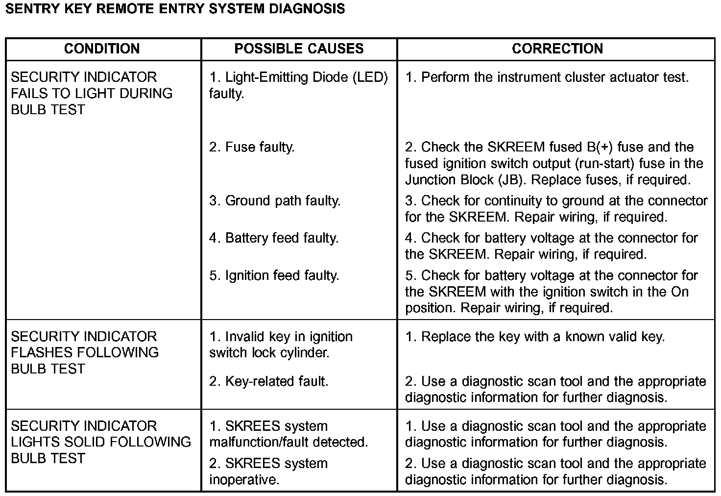 Conventional diagnostic methods may not prove conclusive in the diagnosis of the Sentry Key REmote Entry Module (SKREEM)and the Sentry Key Remote Entry System (SKREES), the ElectroMechanical Instrument Cluster (EMIC), the Powertrain Control Module (PCM), the Controller Area Network (CAN) data bus, or the electronic message inputs used to provide the electronic features of the SKREES. The most reliable, efficient, and accurate means to diagnose the SKREEM, the EMIC, the PCM, the CAN data bus, and the electronic message inputs for the SKREES requires the use of a diagnostic scan tool.
