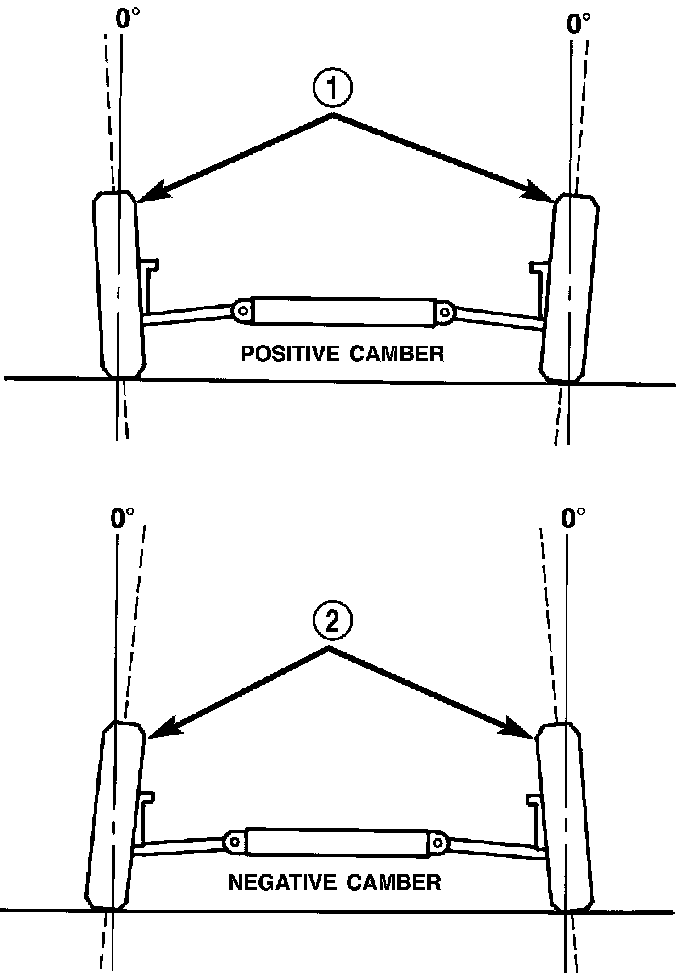 Camber is the inward or outward tilt of the top of the tire and wheel assembly Inward tilt (2) is negative camber. Outward tilt (1) is positive camber. Camber is measured in degrees of angle relative to a true vertical line. Camber is a tire wearing angle.
