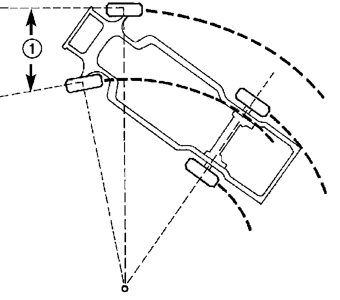 Toe-out on turns is the relative positioning of the front wheels while steering through a turn. This compensates for each front wheel's turning radius. As the vehicle encounters a turn, the outboard wheel must travel in a larger radius circle than the inboard wheel. The steering system is designed to make each wheel follow its particular radius circle. To accomplish this, the front wheels must progressively toe outward as the steering is turned from center. This eliminates tire scrubbing and undue tire wear when steering a vehicle through a turn.