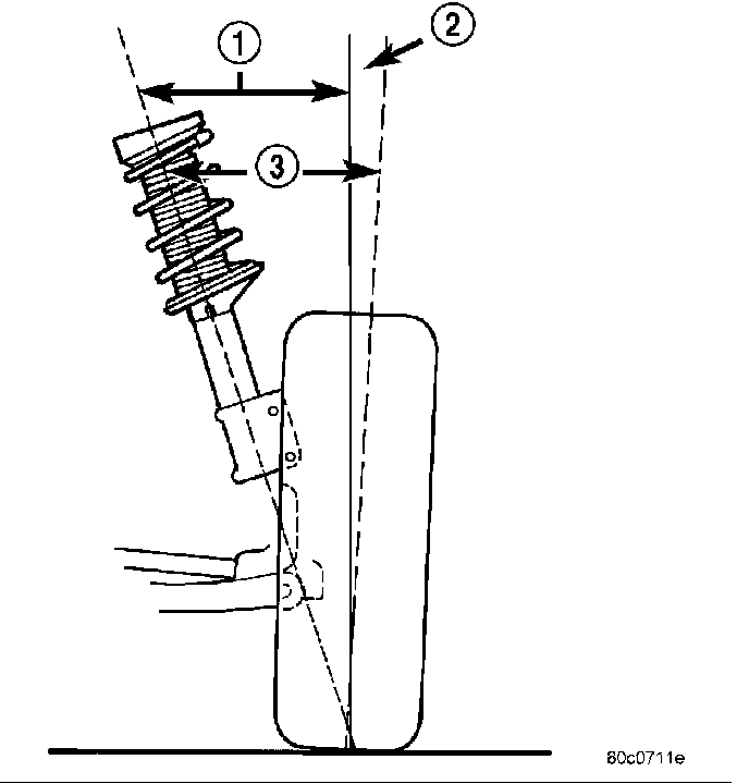 Included angle (3) is the sum of the S.A.I. angle (1) plus or minus the camber angle (2), depending on whether or not the wheel has positive or negative camber. If camber is positive (2), add the camber angle to the S.A.I. angle. If camber is negative, subtract the camber angle from the S.A.I. angle. Included angle is not adjustable, but can be used to diagnose a frame misalignment or bent suspension component (spindle, strut).