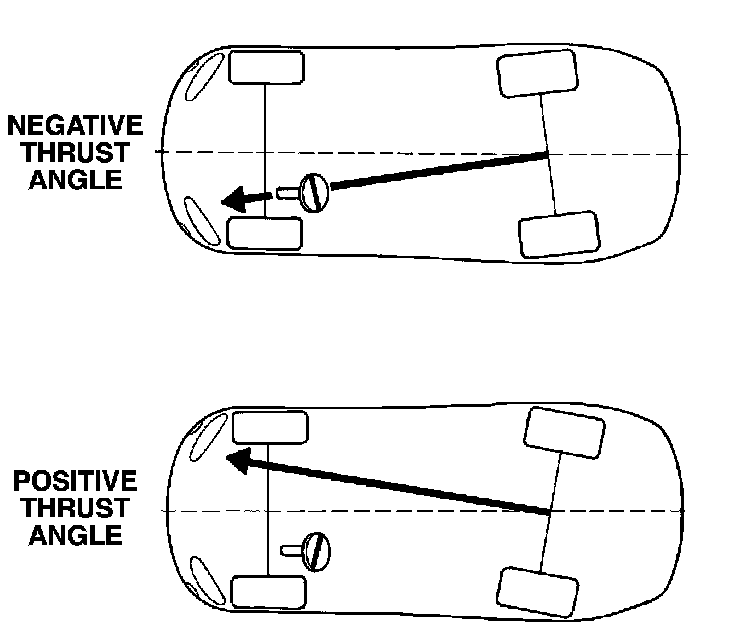 Thrust angle is the averaged direction the rear wheels are pointing in relation to the vehicle's center line. The presence of negative or positive thrust angle causes the rear tires to track improperly to the left or right of the front tires (dog tracking).