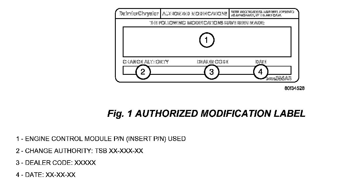 13. Type the necessary information on the "Authorized Modification Label" p/n 04275086AB and attach near the VECI label (Fig. 1).