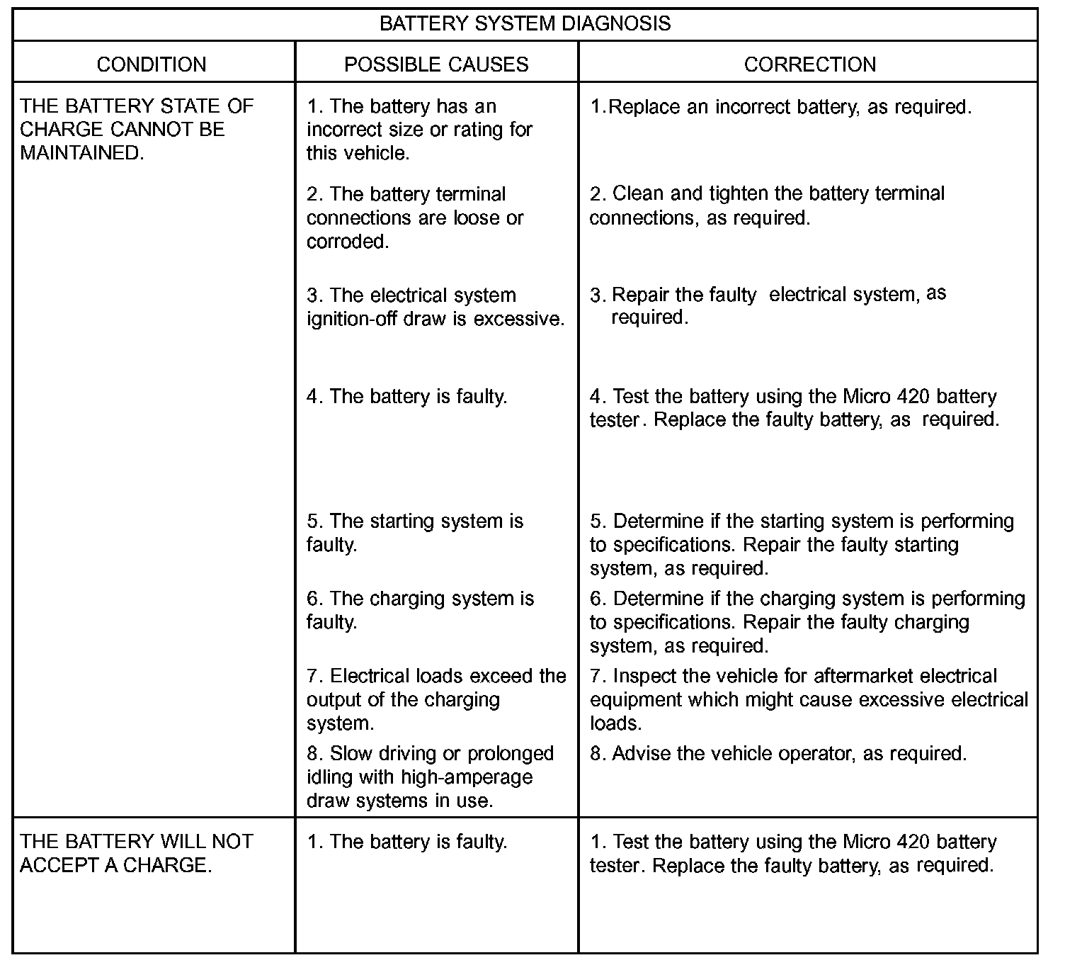 The battery, starting, and charging systems in the vehicle operate with one another and must be tested as a complete system. In order for the engine to start and the battery to maintain its charge properly, all of the components that are used in these systems must perform within specifications. It is important that the battery, starting, and charging systems be thoroughly tested and inspected any time a battery needs to be charged or replaced. The cause of abnormal battery discharge, overcharging or early battery failure must be diagnosed and corrected before a battery is replaced and before a vehicle is returned to service. The systems has been separated to make it easier to locate the specific information you are seeking. However, when attempting to diagnose any of these systems, it is important that you keep their interdependency in mind.The diagnostic procedures used for the battery, starting, and charging systems include the most basic conventional diagnostic methods, to the more sophisticated On-Board Diagnostics (OBD) built into the Powertrain Control Module (PCM). Use of an induction-type milliampere ammeter, a volt/ohmmeter, a battery charger, a carbon pile rheostat (load tester) and a 12-volt test lamp may be required. All OBD-sensed systems are monitored by the PCM. Each monitored circuit is assigned a Diagnostic Trouble Code (DTC). The PCM will store a DTC in electronic memory for any inoperative system it detects.