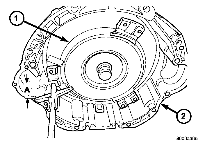 8. Check converter seating with a scale and straightedge (A). Surface of converter lugs should be at least 19 mm (3/4 inch) to rear of straightedge when converter is fully seated.