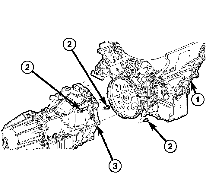 12. Raise transmission (3) and align the torque converter with the drive plate and the transmission converter housing with the engine block (1).