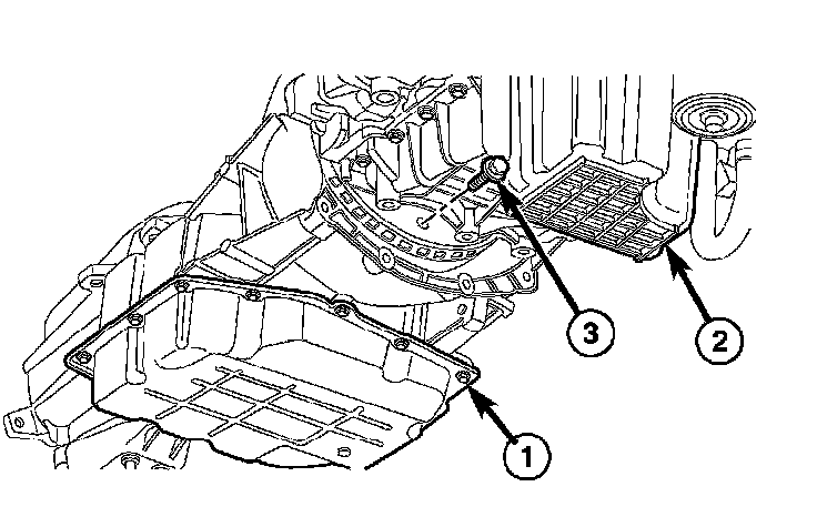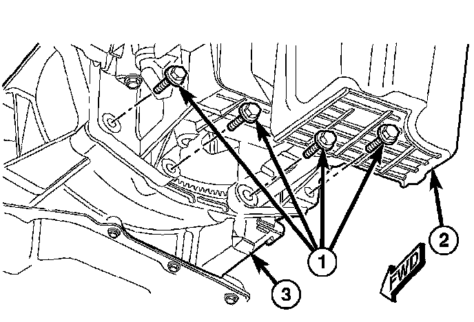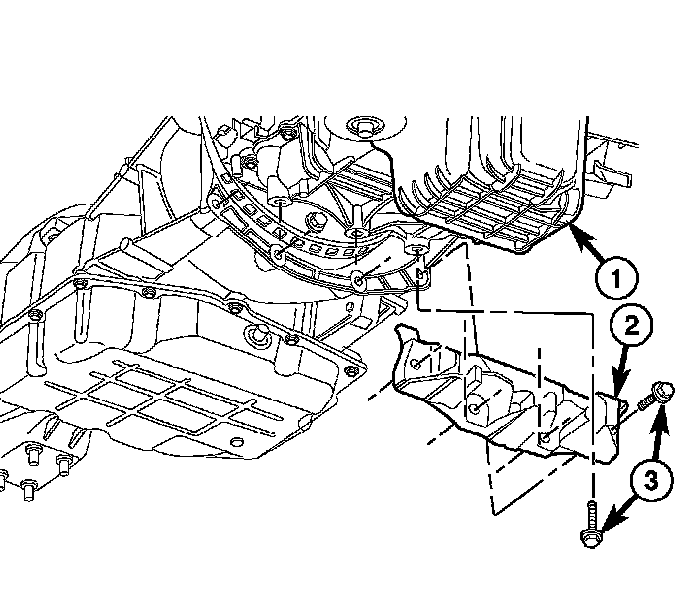 21. Install the transmission (3) to engine oil pan (2) bolts (1). Tighten to 39 Nm (29 ft. lbs.).