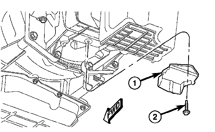 28. Install the torque converter bolt access cover (1) onto the transmission, for vehicles equipped with 3.5L engines. Install the access cover bolt (2) and tighten to 11 Nm (8 ft. lbs.).