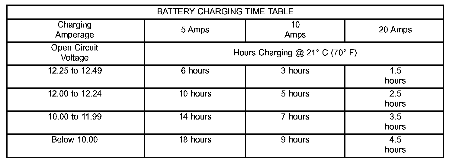 The Battery Charging Time Table gives an indication of the time required to charge a typical battery at room temperature based upon the battery state-of-charge and the charger capacity.