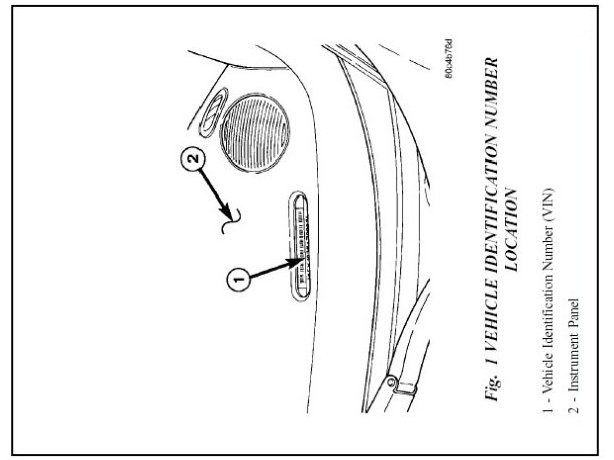 The Vehicle Identification Number (VIN) is located on the upper left corner of the instrument panel, near the left A-Pillar. The VIN consists of 17 characters in a combination of letters and numbers that provide specific information about (Fig. 1). Refer to VIN Code Decoding Chart.