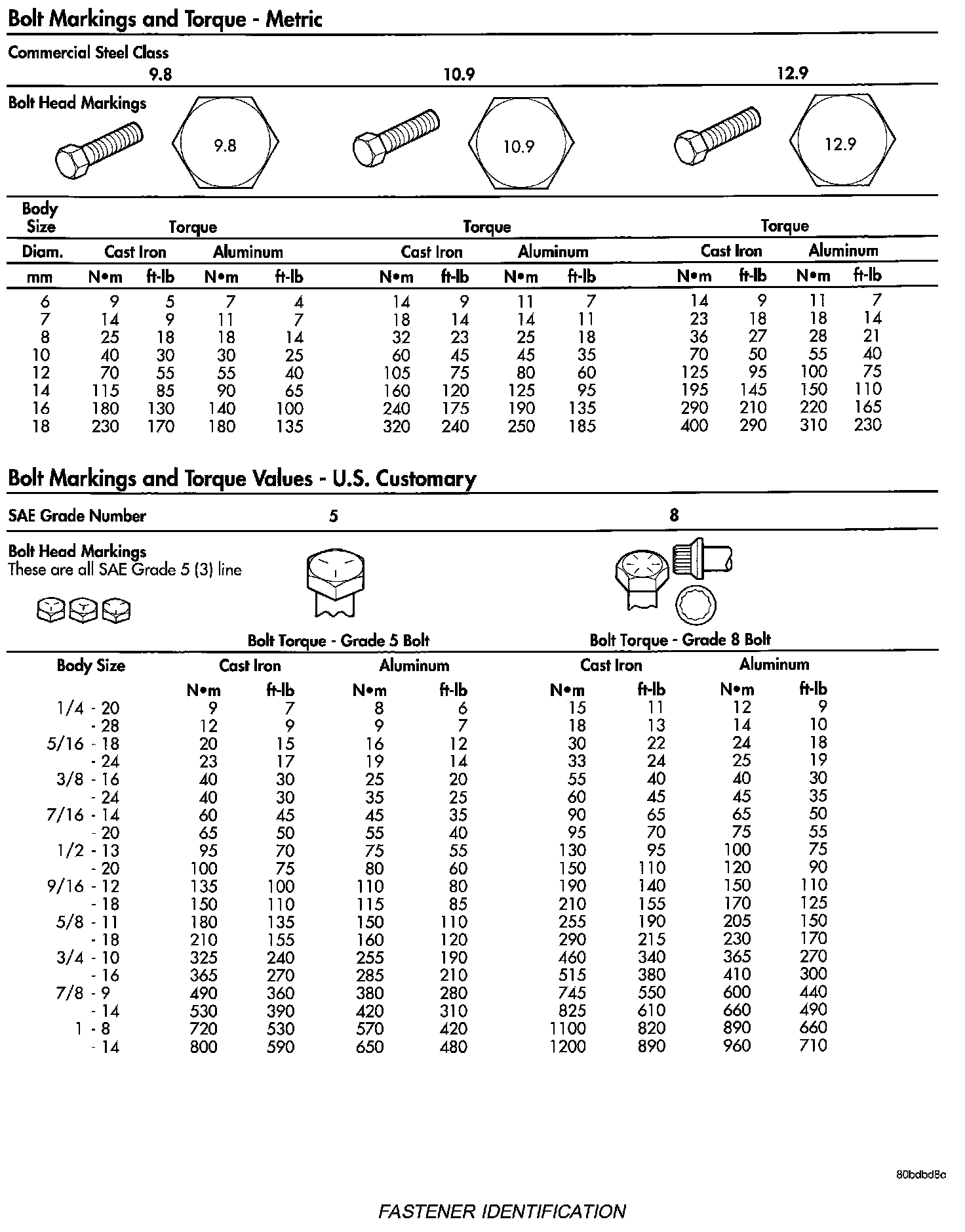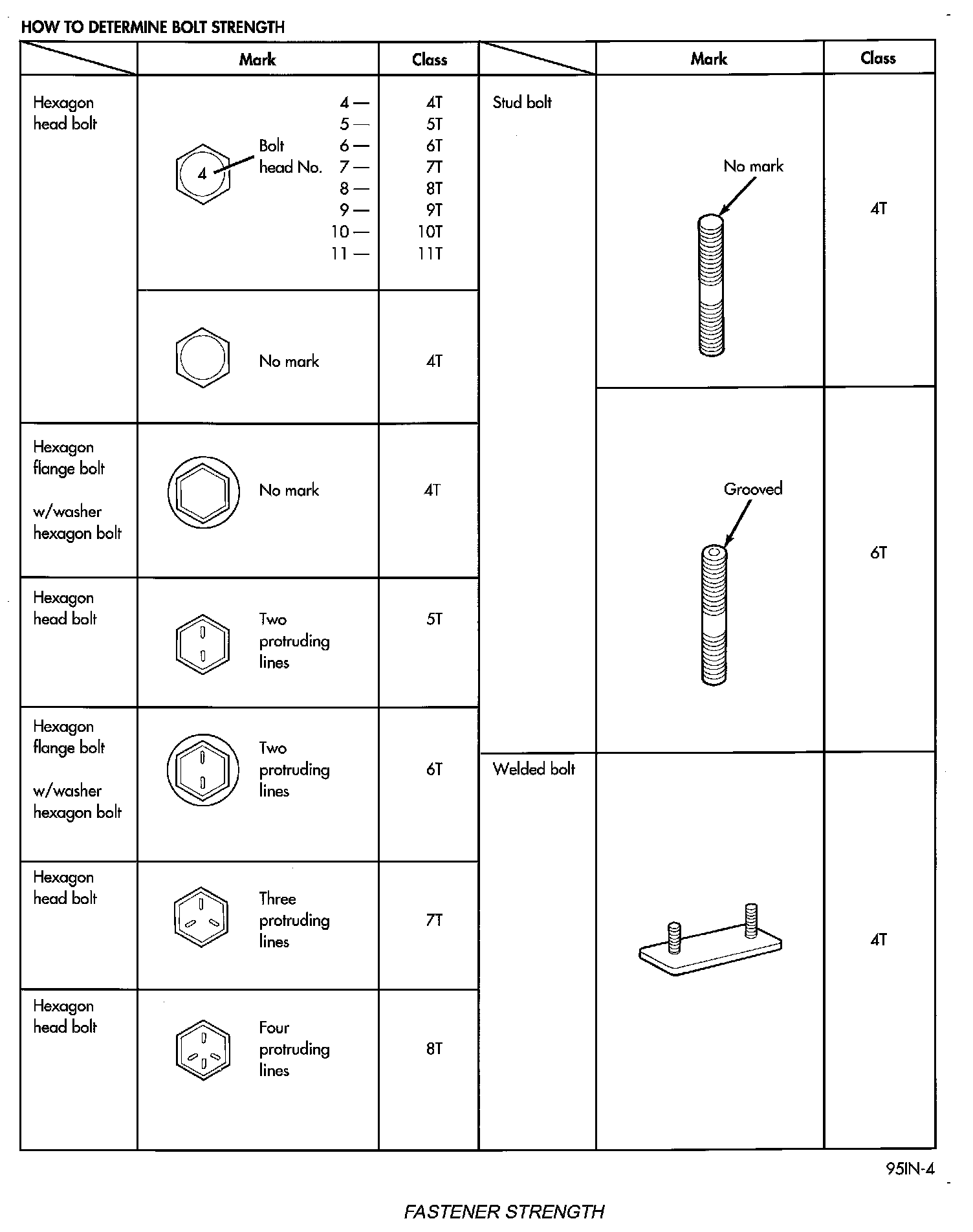 The SAE bolt strength grades range from grade 2 to grade 8. The higher the grade number, the greater the bolt strength. Identification is determined by the line marks on the top of each bolt head. The actual bolt strength grade corresponds to the number of line marks plus 2. The most commonly used metric bolt strength classes are 9.8 and 10.9. The metric strength class identification number is imprinted on the head of the bolt. The higher the class number, the greater the bolt strength. Some metric nuts are imprinted with a single-digit strength class on the nut face. Refer to the Fastener Identification and Fastener Strength Charts.