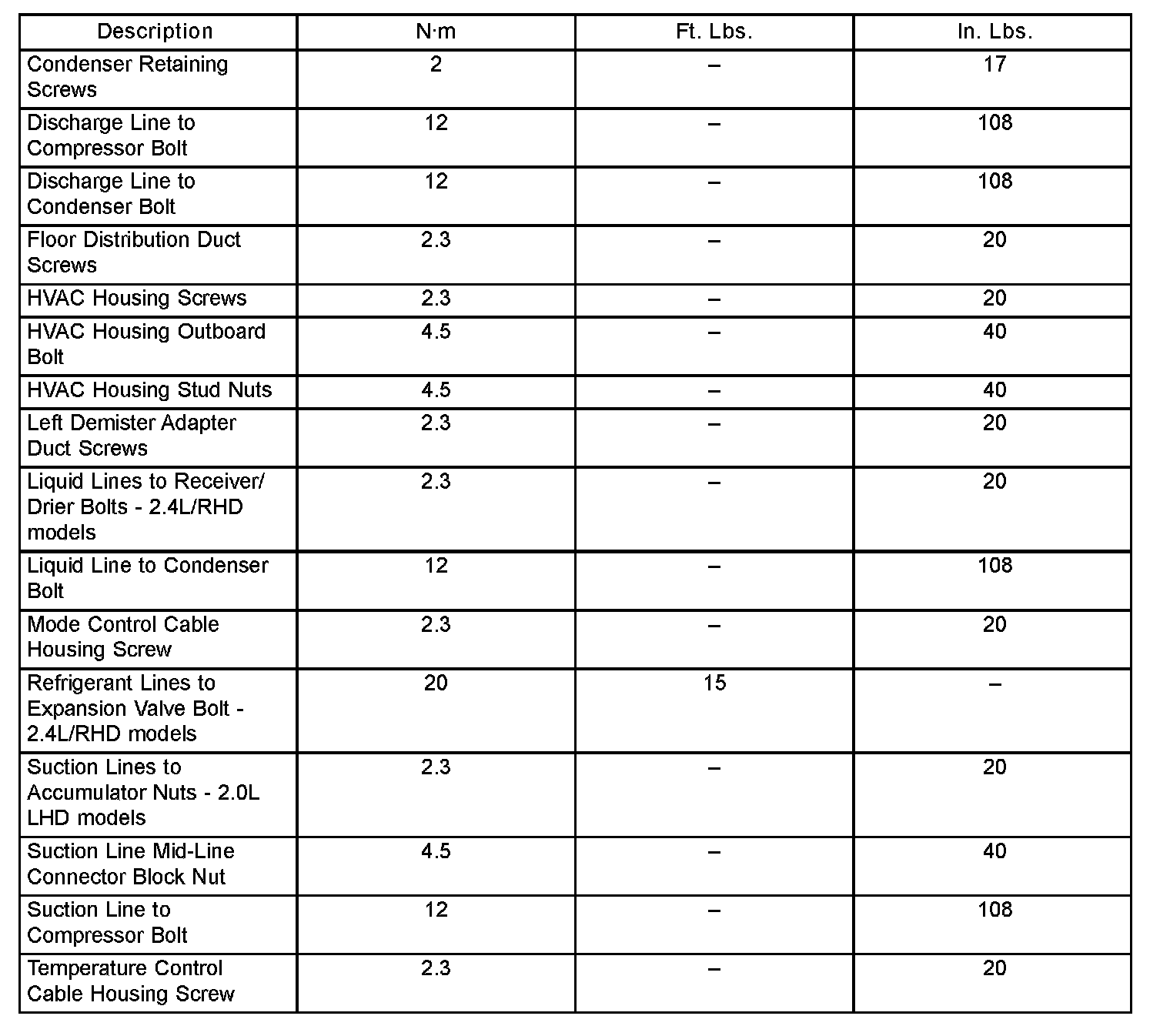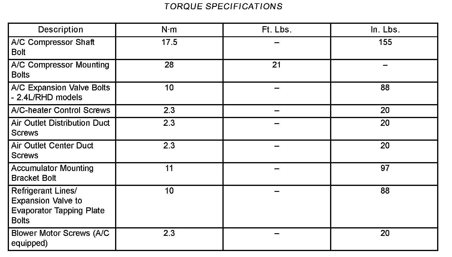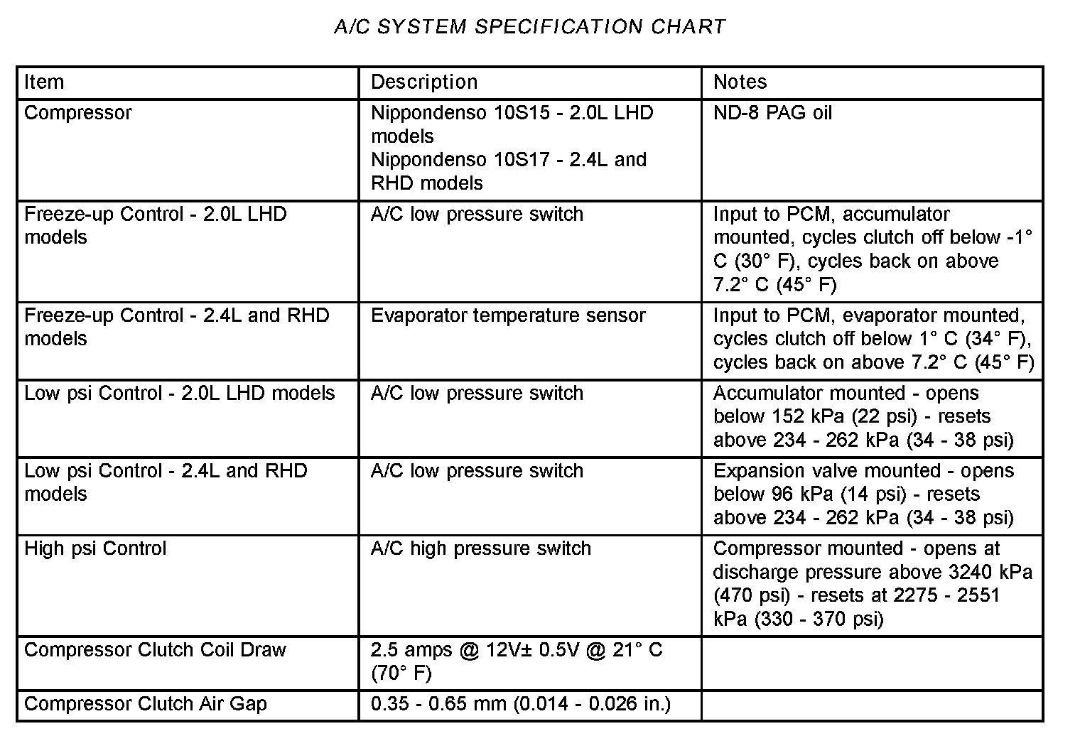 A/C System Specification Chart:
