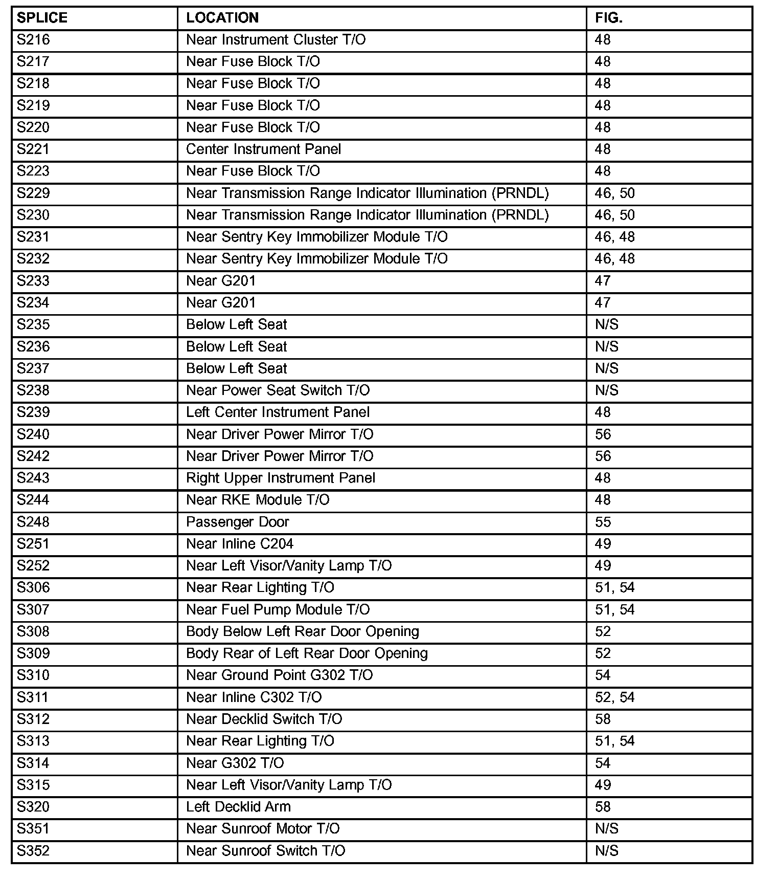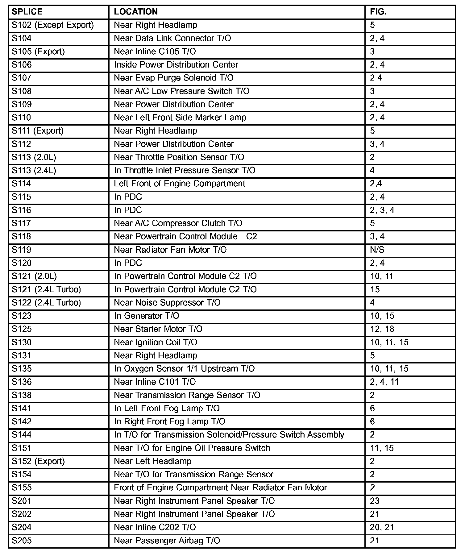 The abbreviation T/O (Take Out) is used in the location column to indicate a point in which the wiring harness branches out to a component.