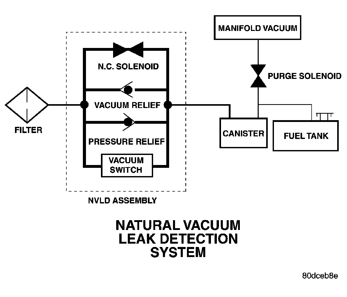 The Natural Vacuum Leak Detection (NVLD) system is the next generation evaporative leak detection system that will first be used on vehicles equipped with the Next Generation Controller (NGC) starting in 2002 M.Y. This new system replaces the leak detection pump as the method of evaporative system leak detection. The current CARB requirement is to detect a leak equivalent to a 0.0209 inches (0.5 mm) hole. This system has the capability to detect holes of this size very dependably.