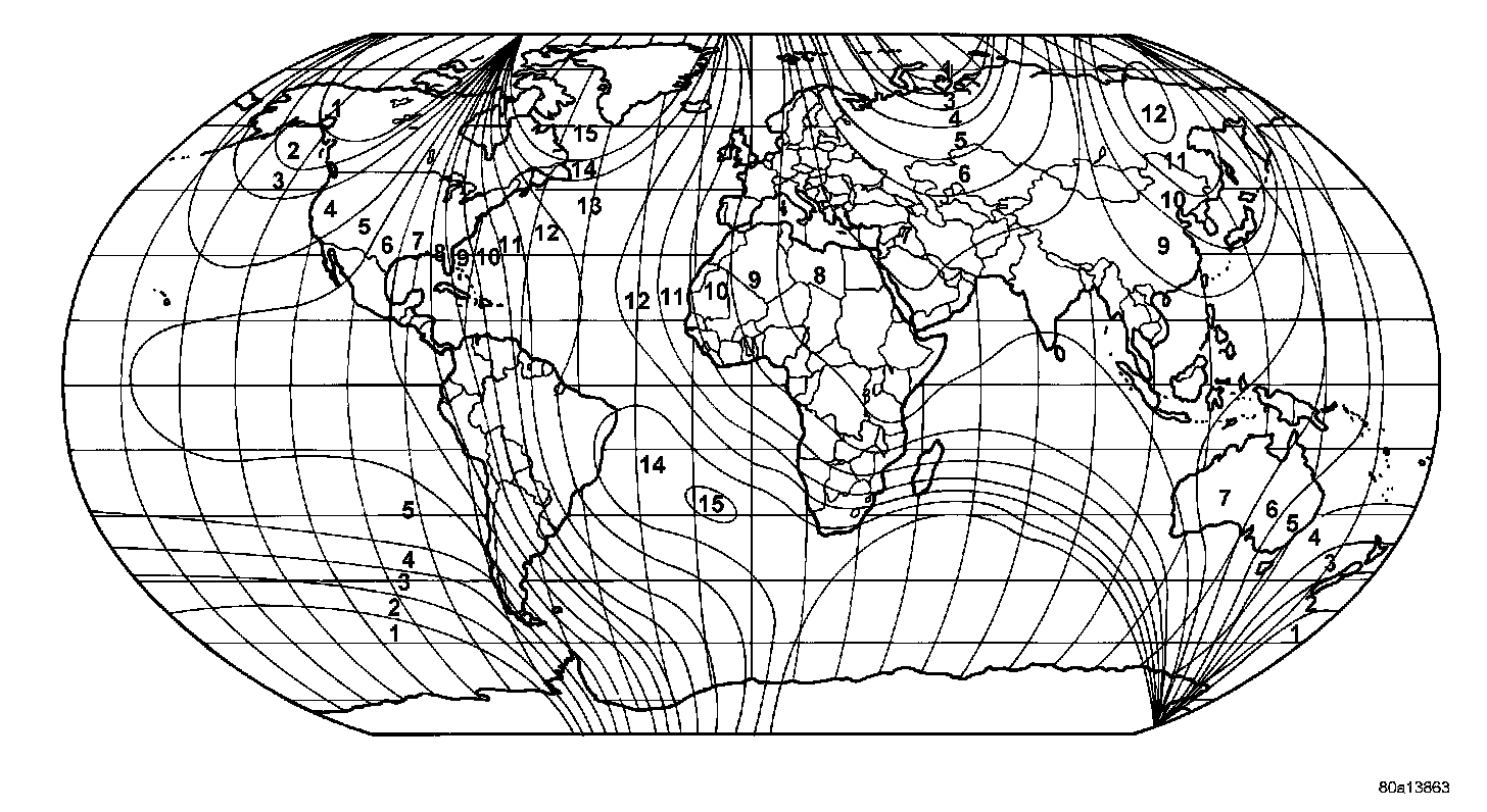 The compass has a default zone of 8. Refer to the Zone Variance Map to determine the correct zone number. The correct compass Zone selection is critical to proper compass operation. With the ignition in the ON position, pressing the Zone/Cal button (left reading lamp button) for 5-10 seconds and then releasing while ZONE is illuminated enters the compass into the Zone display mode. In the Zone display mode, ZONE will be illuminated instead of the temperature. The current Zone number, 1 through 15 will be displayed. While ZONE is illuminated; momentarily pressing the Zone/Cal button advances the zone to the next higher zone. When the desired zone number is displayed, do not press the Zone/Cal button again. After 5 seconds, the Zone Variance number will be stored in the module memory.