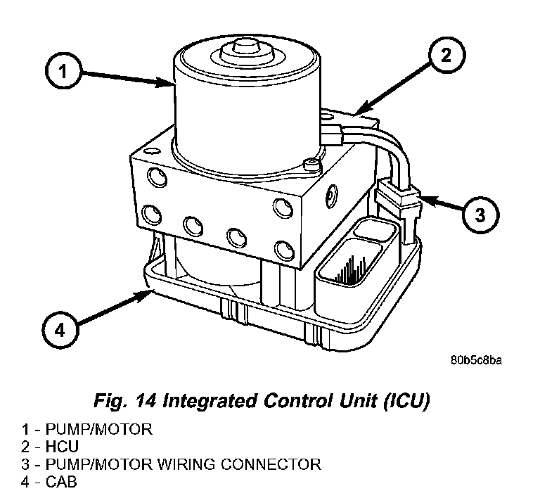 The Hydraulic Control Unit (HCU) and the Controller Antilock Brake (CAB) used with this antilock brake system are combined (integrated) into one unit, which is called the Integrated Control Unit (ICU) (Fig. 14). The ICU is located on the driver's side of the vehicle, below the master cylinder (Fig. 15).