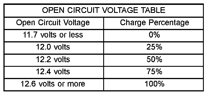 See the Open-Circuit Voltage Table. This voltage reading will indicate the battery state-of-charge, but will not reveal its cranking capacity. If a battery has an open-circuit voltage reading of 12.4 volts or greater, it may be load tested to reveal its cranking capacity .