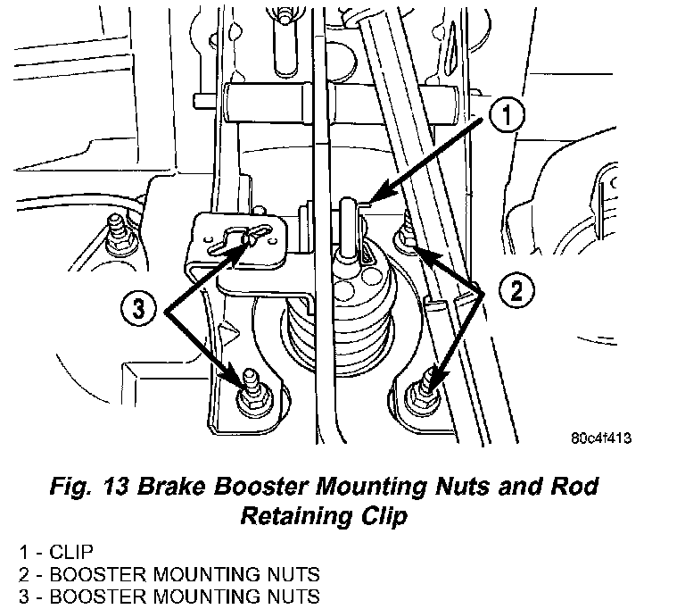 5. Connect brake booster rod to brake pedal. Install retainer clip (Fig. 13).