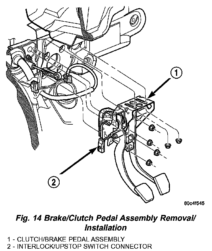 6. Remove two pedal assembly bracket to instrument panel nuts (Fig. 14).
