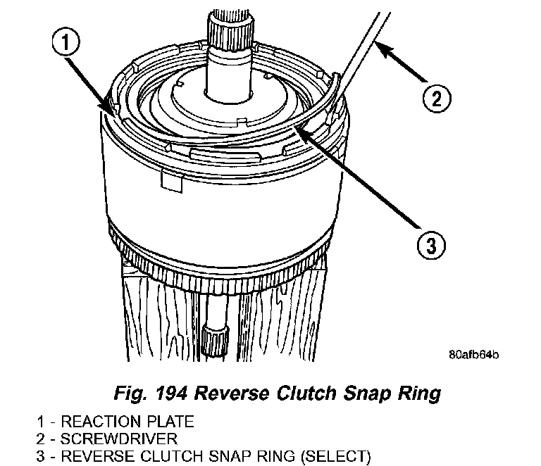 2. Tap down reverse clutch reaction plate to release pressure from snap ring (Fig. 193).