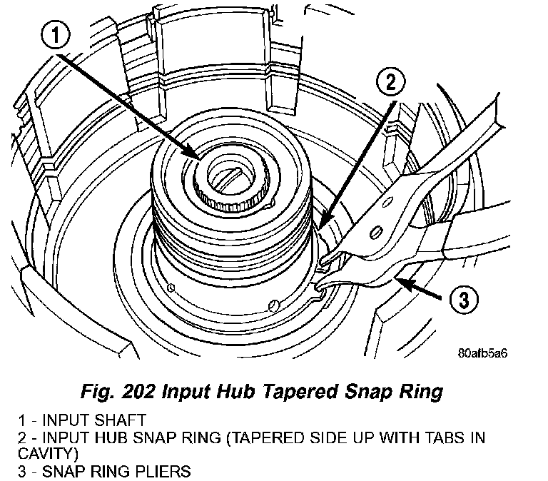 15. Remove input hub tapered snap ring (Fig. 202) (Fig. 208).