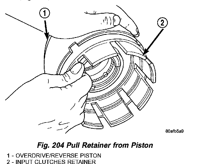 17. Separate clutch retainer from OD/Reverse piston (Fig. 204).