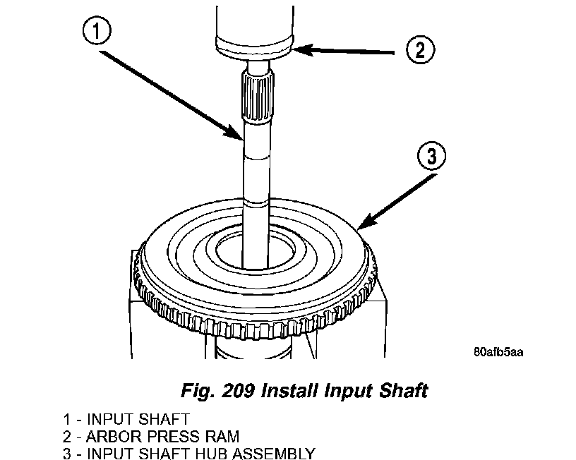 1. Using an arbor press, install input shaft to input shaft hub (Fig. 209).