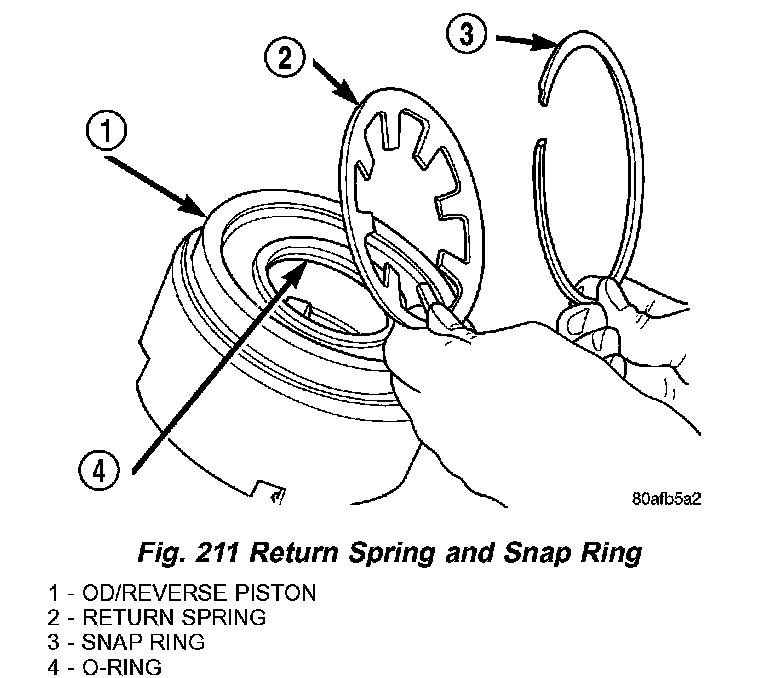 3. Using an arbor press and Tool 6057, Install OD/Reverse piston return spring and snap ring (Fig. 211) (Fig. 212).