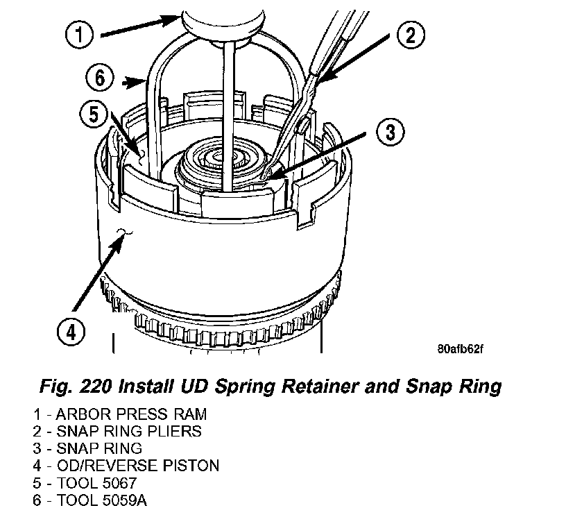 9. Using Tool 5059A and an arbor press, Install the UD spring retainer and snap ring (Fig. 219) (Fig. 220) (Fig. 221) Compress just enough to install snap ring.