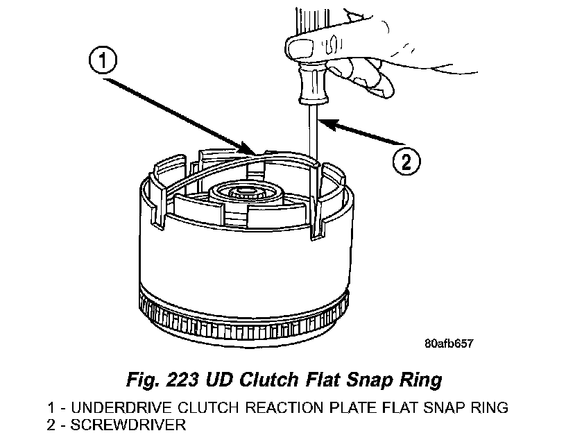 11. Install the UD clutch flat snap ring (Fig. 223).
