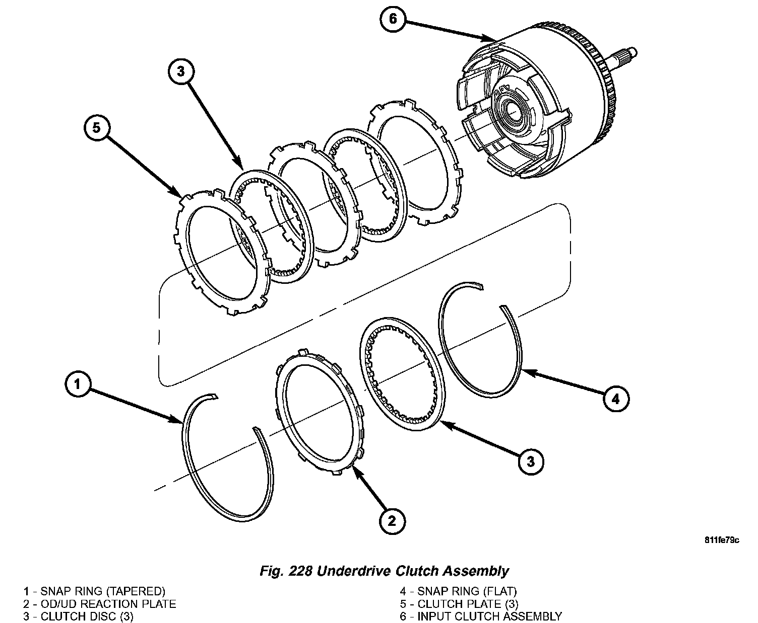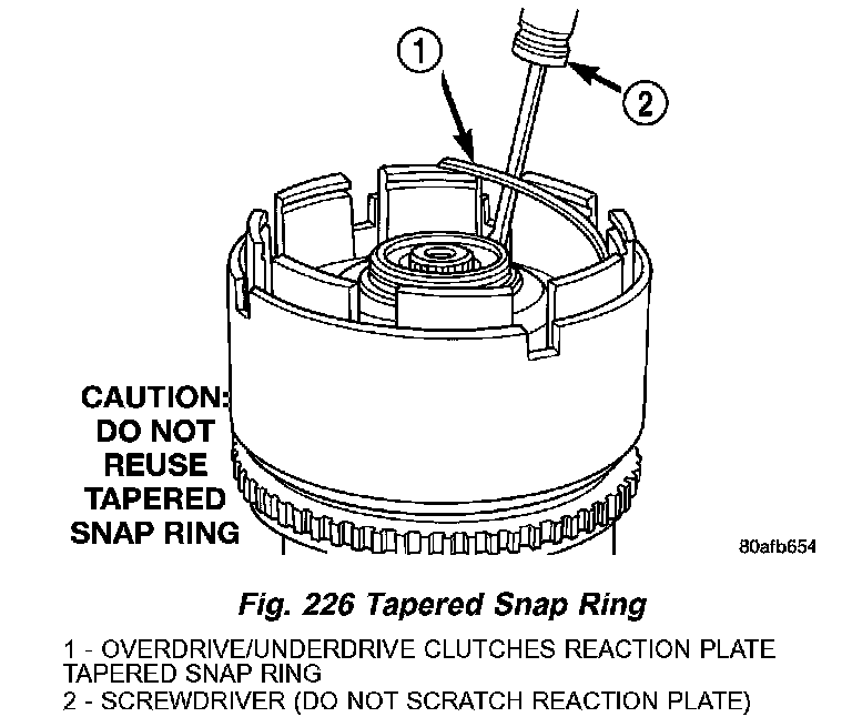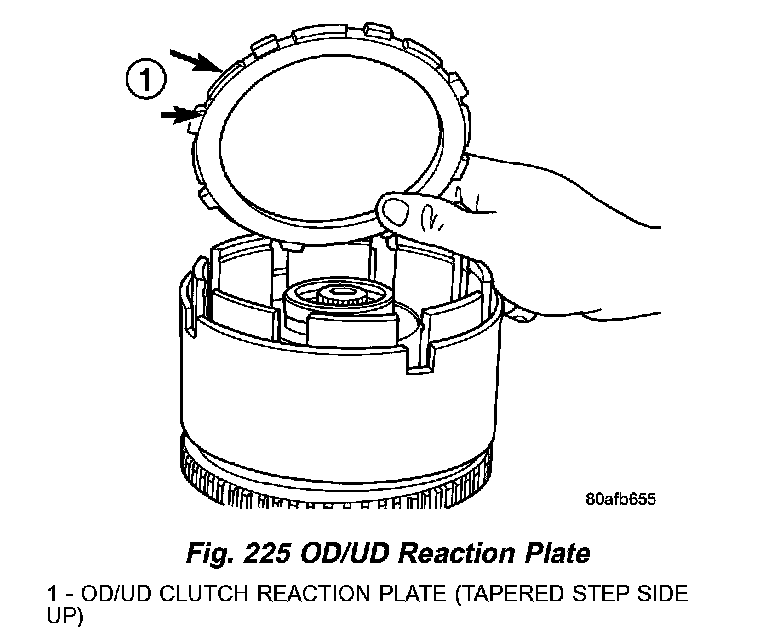 13. Install the OD/UD clutch reaction plate and snap ring (Fig. 225) (Fig. 226). The OD/UD clutches reaction plate has a step on both sides. Install the OD/UD clutches reaction plate tapered step side up.