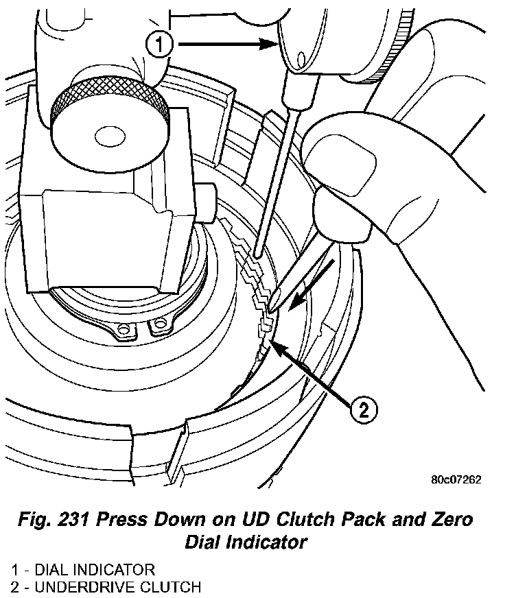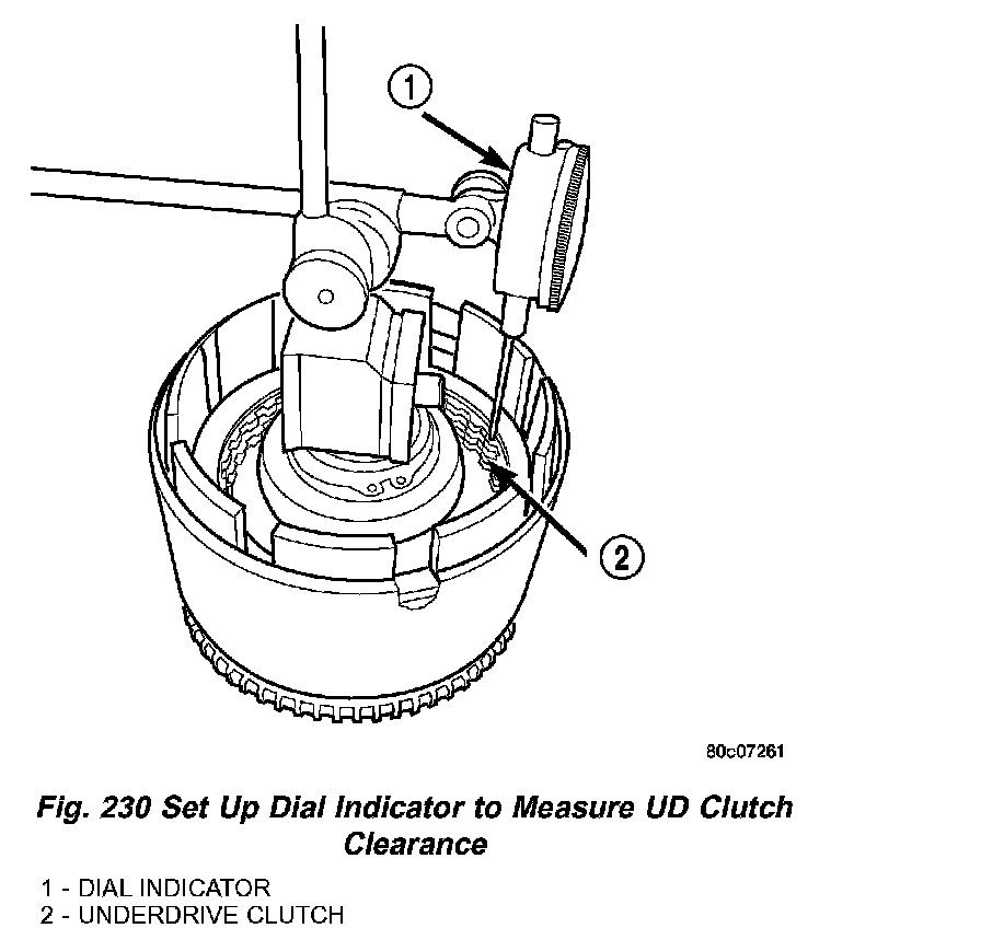 16. Set up dial indicator on the UD clutch pack as shown in (Fig. 230).