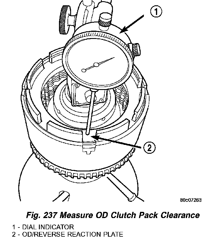 25. Measure OD clutch pack clearance. Set up dial indicator on top of the OD/Reverse pressure plate as shown in (Fig. 237).
