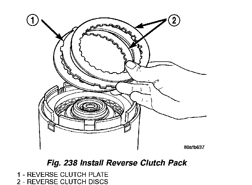 28. Install reverse clutch pack (two frictions/one steel) (Fig. 238).