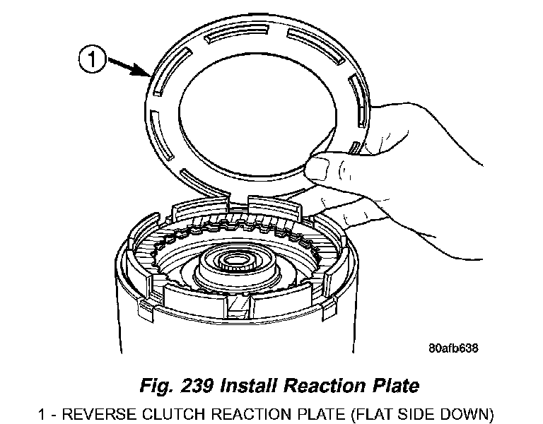 29. Install reverse clutch reaction plate with the flat side down towards reverse clutch (Fig. 239).