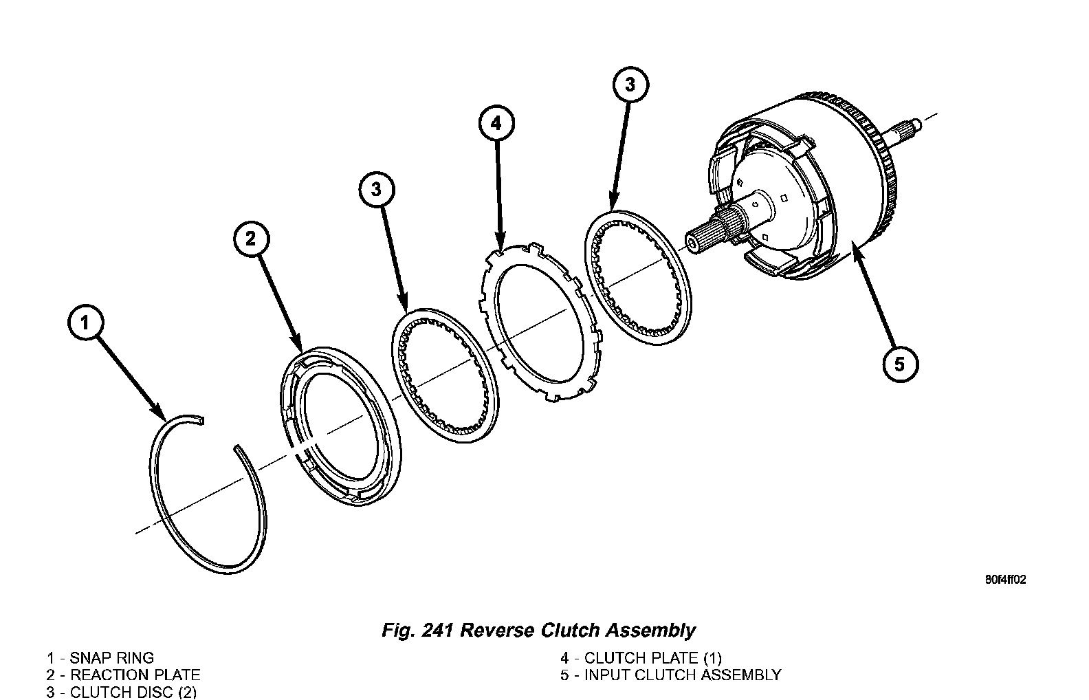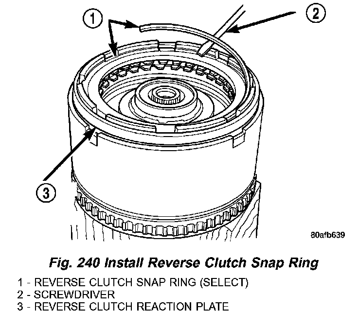 30. Tap reaction plate down to allow installation of the reverse clutch snap ring. Install reverse clutch snap ring (Fig. 240) (Fig. 241).