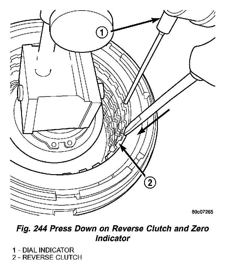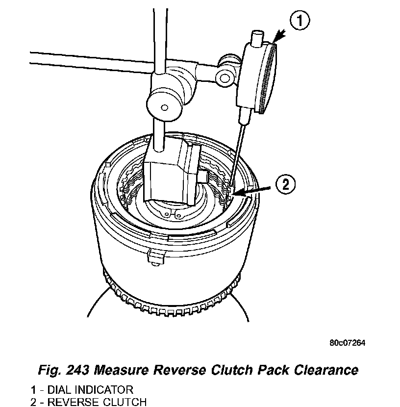 32. Set up a dial indicator on the reverse clutch pack as shown in (Fig. 243).