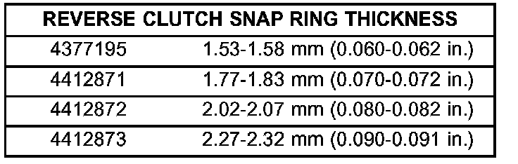 35. Take average of four measurements and compare with reverse clutch pack clearance specification. The reverse clutch pack clearance is 0.89 - 1.37 mm (0.035 - 0.054 inch). Select the proper reverse clutch snap ring to achieve specifications: