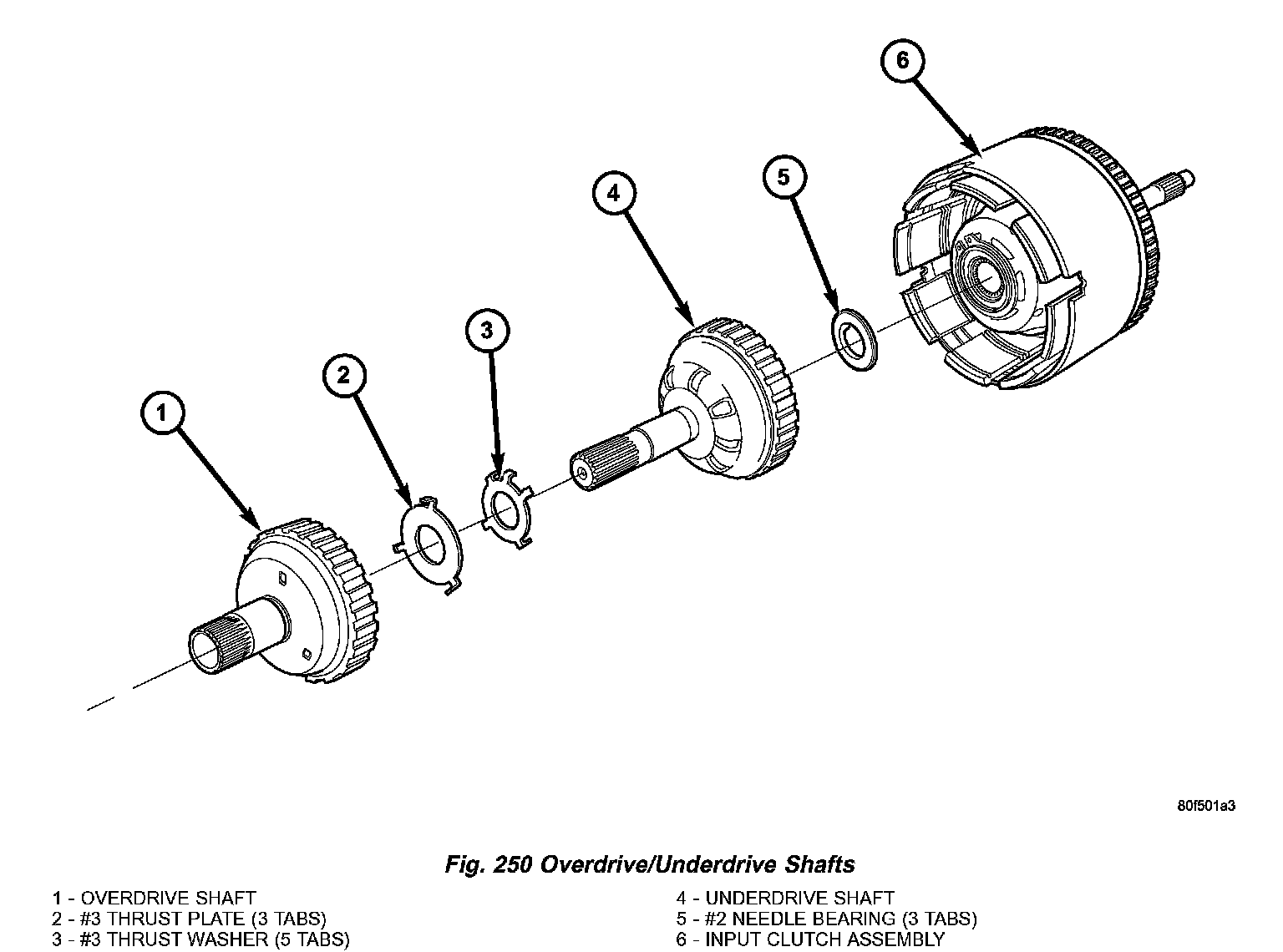 39. Install the #3 thrust washer to the underdrive shaft assembly. Be sure five tabs are seated properly (Fig. 247).