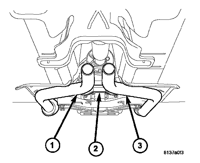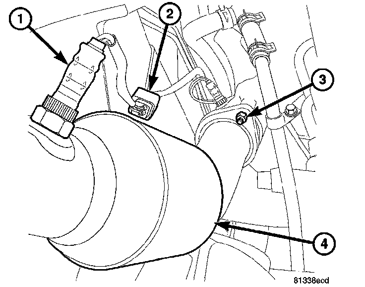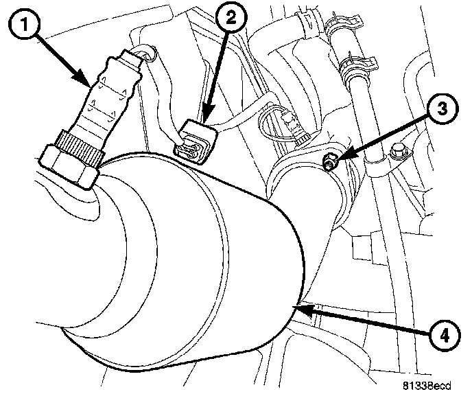 1. Install catalytic converter (3) onto exhaust manifold ball flange. Only finger tighten nuts at this time.